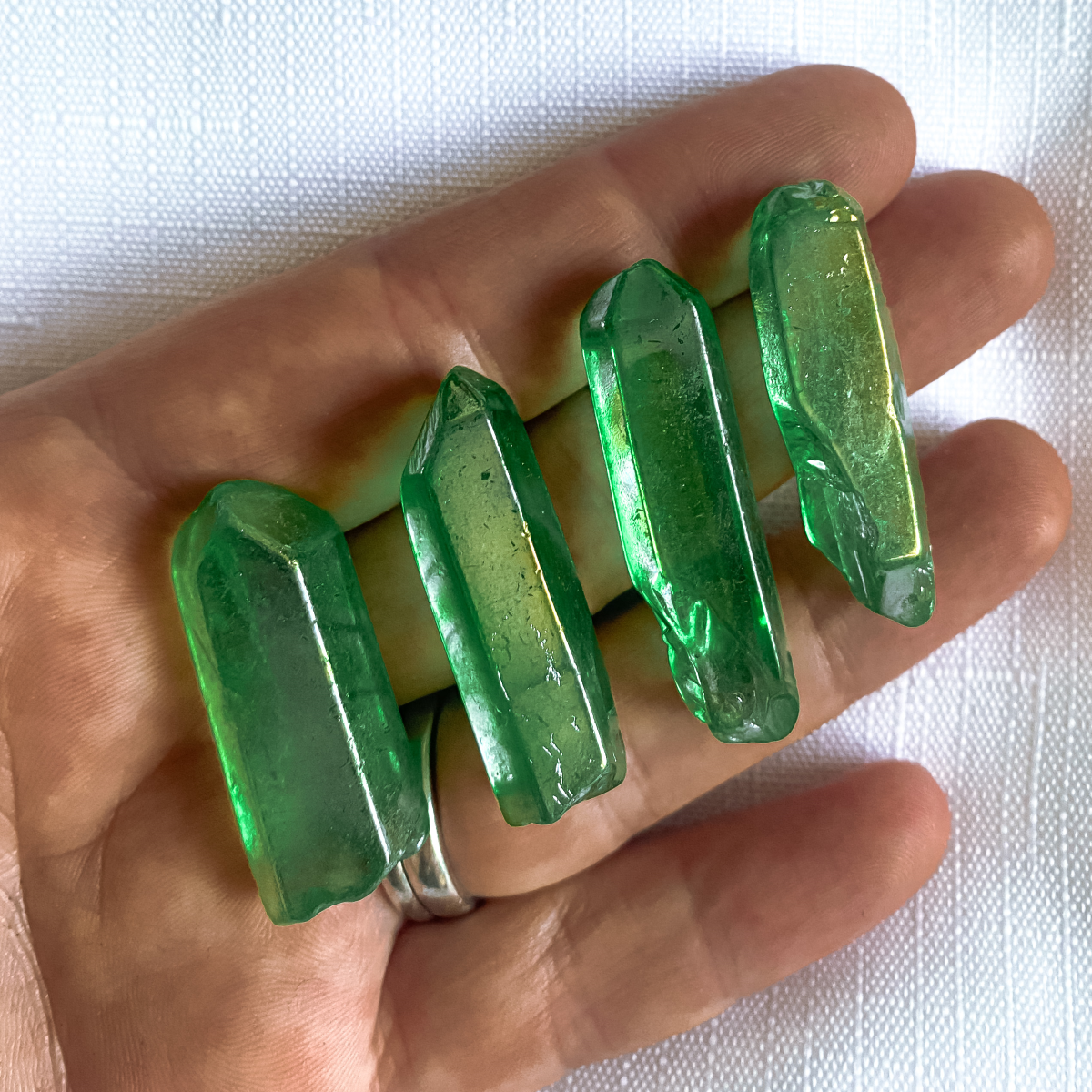 These aura quartz generators magnify your prayers, intentions, and desires, and purify them before they send them straight up to Source. These are pure light! Aura quartz has become one of my favorite tools. And if you take one of these generators home, you will understand why. This extraordinary, sparkling variety of quartz is quite challenging to find, but well worth the hunt. Each piece is a magical, shimmering, angelic point, with rainbows bursting out in all directions