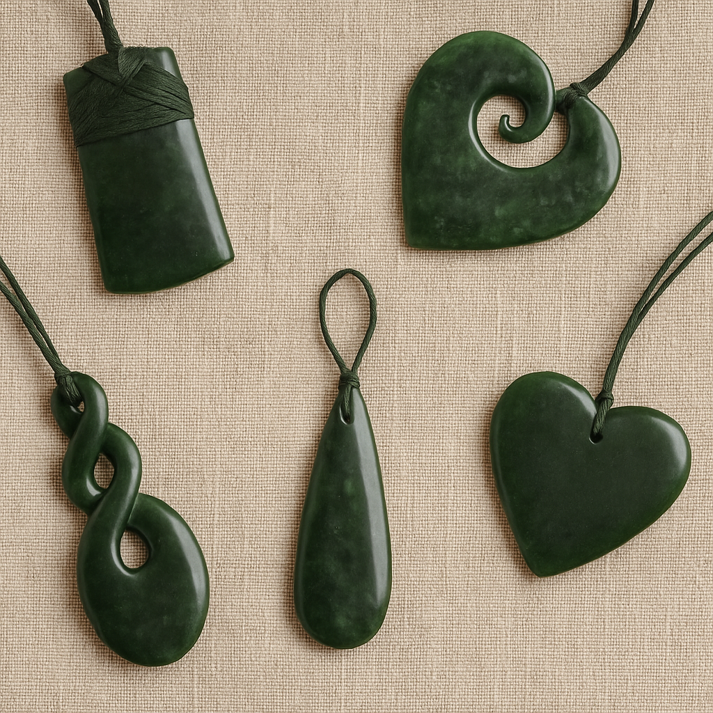 Five New Zealand greenstone pendants — toki, koru, twist, roimata and heart — arranged on beige fabric for the Top 5 Greenstone Gifts for Homesick Kiwis blog.”