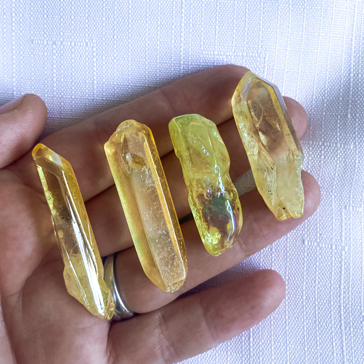These aura quartz generators magnify your prayers, intentions, and desires, and purify them before they send them straight up to Source. These are pure light! Aura quartz has become one of my favorite tools. And if you take one of these generators home, you will understand why. This extraordinary, sparkling variety of quartz is quite challenging to find, but well worth the hunt. Each piece is a magical, shimmering, angelic point, with rainbows bursting out in all directions